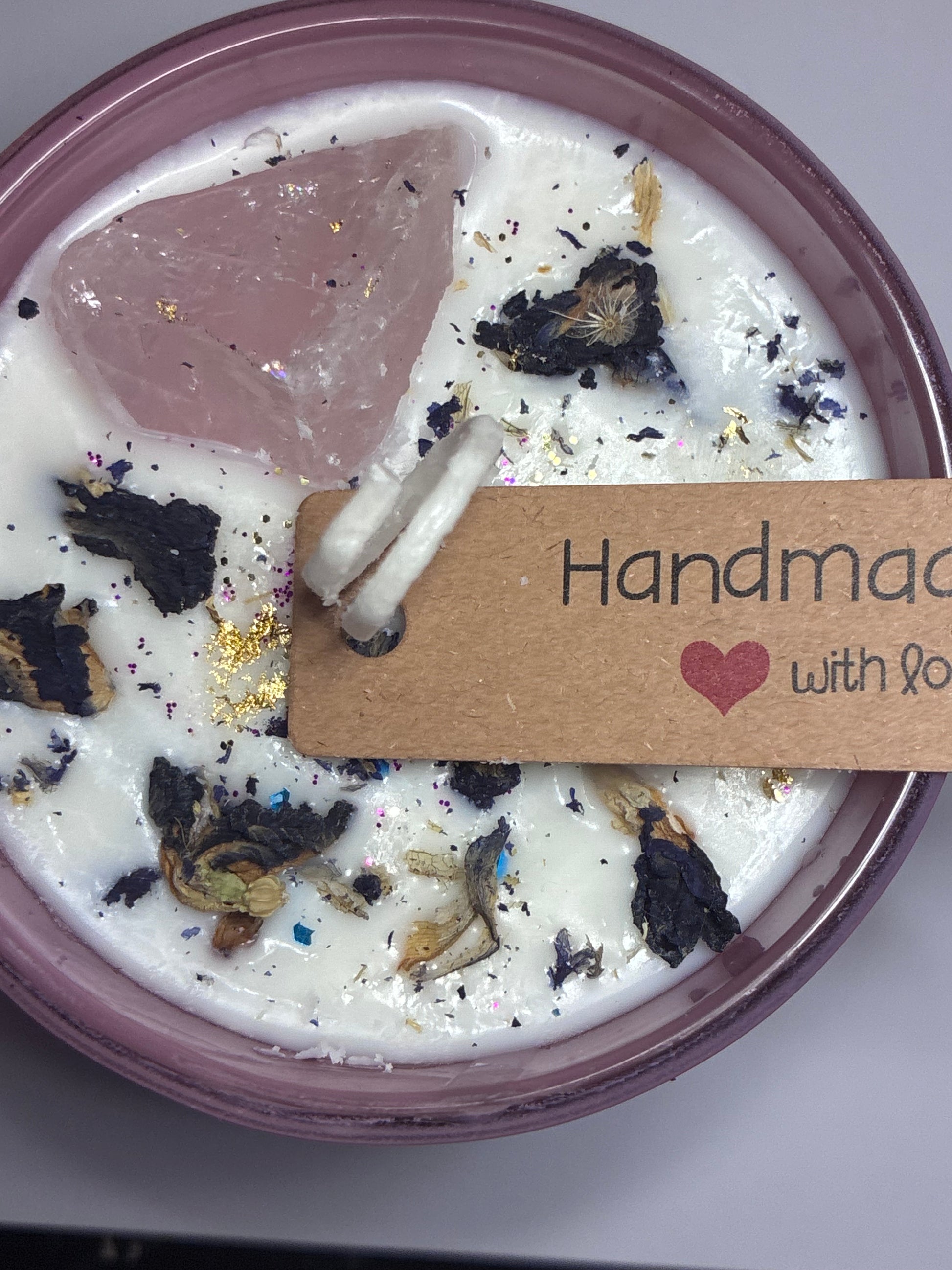 10 oz Handcrafted Soy Wax Candle infused with the energy of clear quartz to amplify and speed up the process!